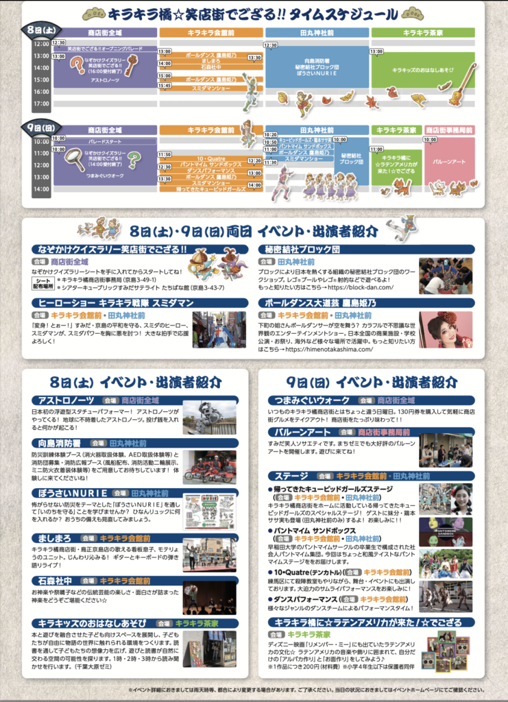 内容: つまみ食いウォーク、ヒーローショー、踊り・ダンスパフォーマンス、なぞかけクイズラリー、防災体験、バルーンアートなど