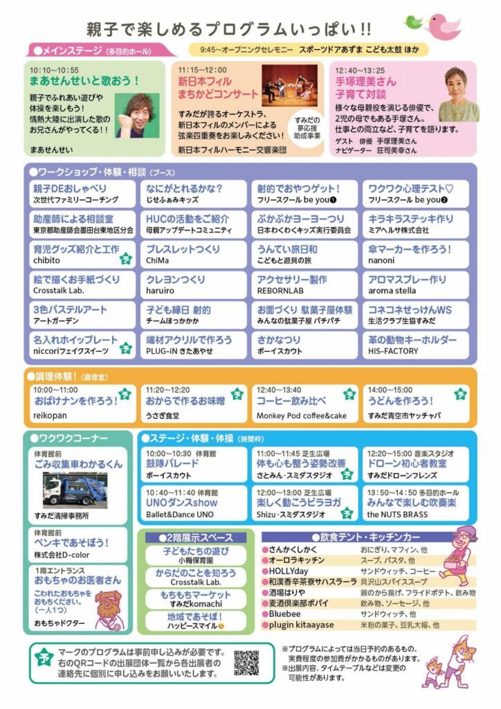 - 内容:親子体操、ヨガ、鼓笛隊演奏、アクセサリー作り、調理体験、ドローン体験、ゴミ収集車見学、おもちゃ修理、新日本フィルハーモニー交響楽団メンバーによる弦楽コンサート、俳優・手塚理美さんと荘司美幸さんの子育て対談 ほか