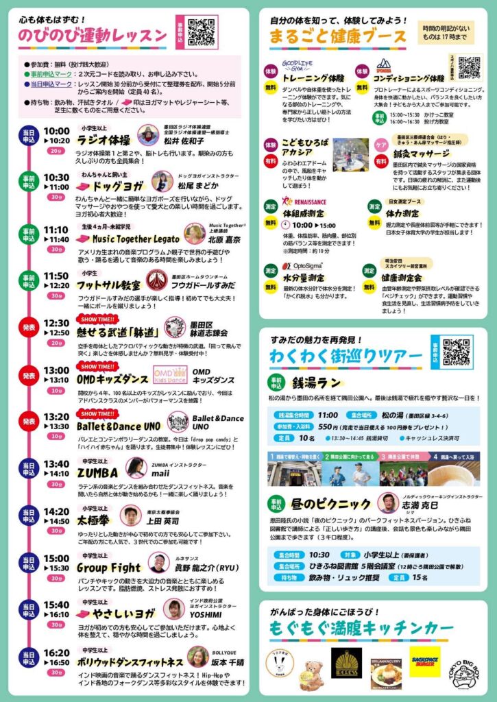 「運動ってきつい」がいつの間にか「楽しい」に変わる!隅田公園の心地よい風を感じながら、自分にぴったりの運動を見つけてみませんか?レッスンやフィットネス体験など多彩なブースが集結。心ゆくまで体を動かした後は、キッチンカーやマルシェの絶品グルメでお腹も心も満たされる!世代を超えて繋がり、身も心もリフレッシュ。新しい自分に出会える1日をみんなで一緒に楽しもう!