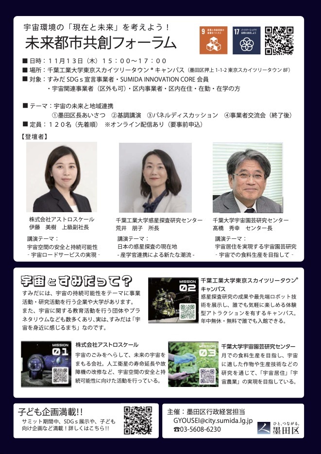 11月1日から12月7日まで、墨田区内各所で「未来都市共創サミット」が開かれます。SDGs未来都市・すみだを舞台に、宇宙・防災・地域交流・教育など、多様なテーマのイベントが実施されます。