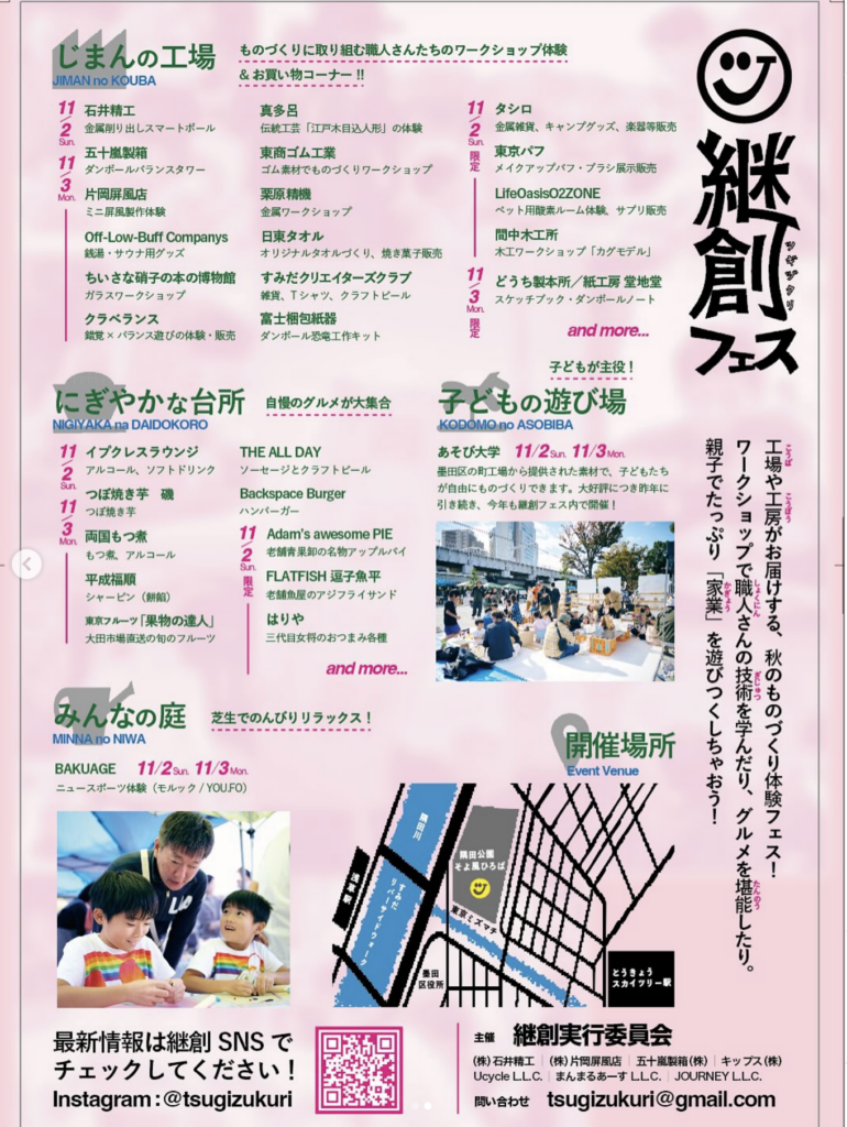 親子で楽しめるものづくり体験フェス「継創(ツギヅクリ)フェス2025」が11月2日・3日の2日間、隅田公園そよ風ひろば(墨田区向島1)で開かれます。主催は継創実行委員会、後援は墨田区です。