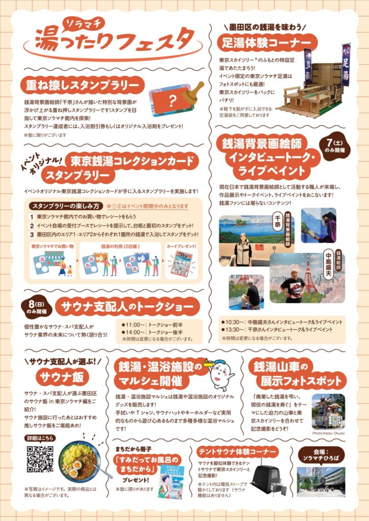 現在、日本では数少ない銭湯背景画絵師のライブペイントやトークイベントや、サウナ施設支配人によるトークイベント、また、ソラマチ館内をめぐる重ね捺しスタンプラリーや、ソラマチ湯ったりフェスタ限定の「東京銭湯コレクションカード」もお目見え!